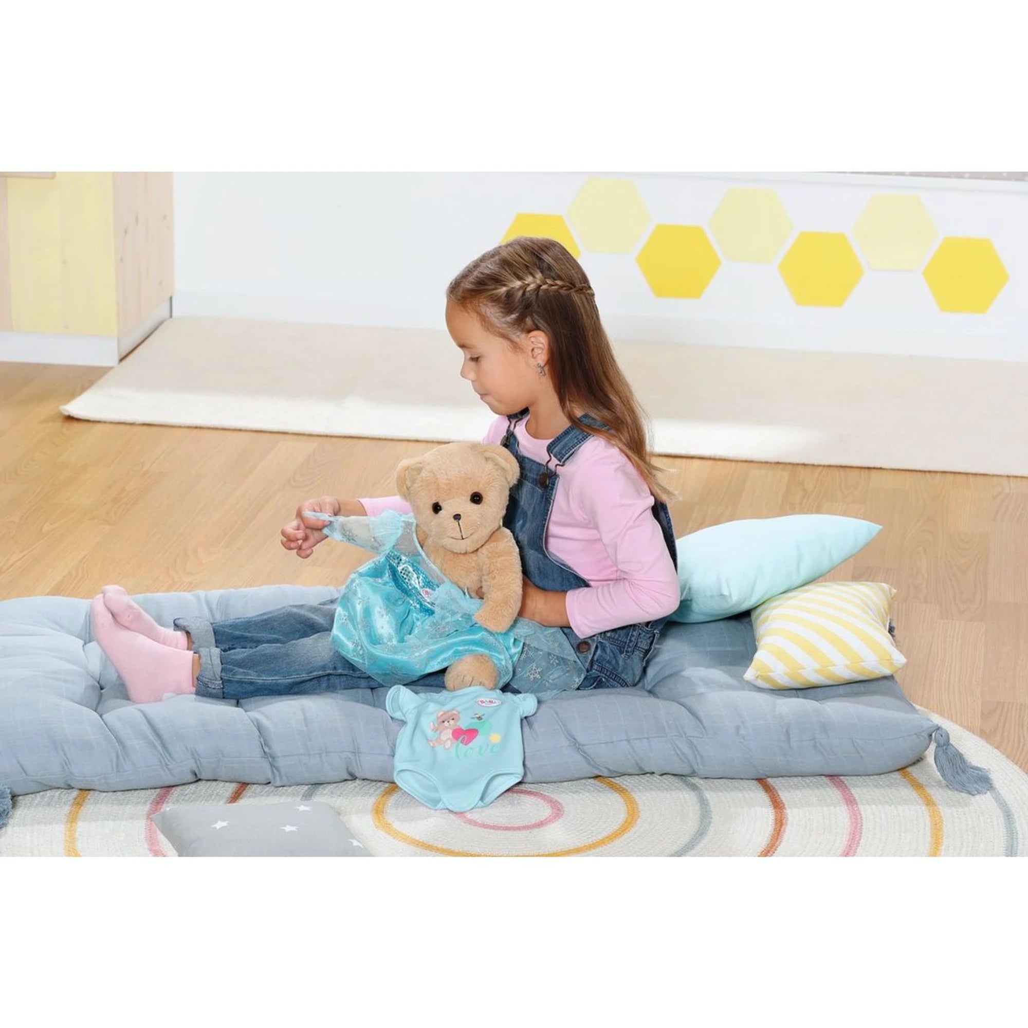 Va vestido con un favorecedor conjuntito azul. Hay más conjuntos y accesorios disponibles por separado en la colección de moda. El osito está diseñado para que le quede casi toda la ropa de Baby Born de tamaño 43 cm.