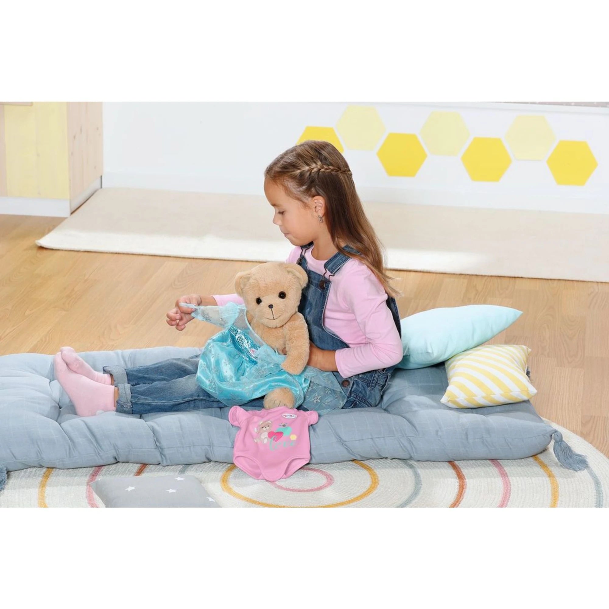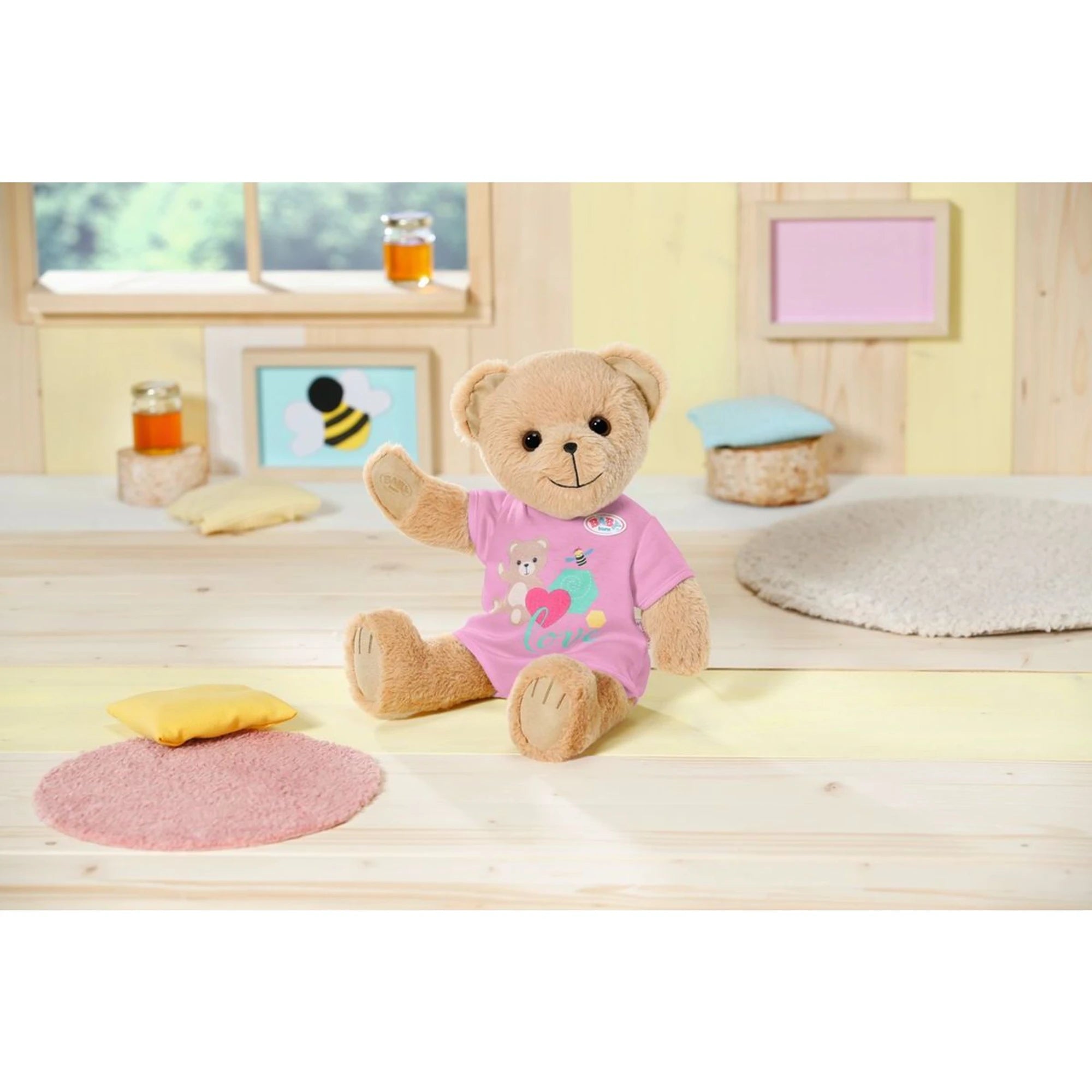 Va vestida con un favorecedor conjuntito rosa. Otros conjuntitos y accesorios están disponibles por separado en la colección de moda. La osita está diseñada para que le sirva casi toda la ropa de Baby Born de tamaño 43 cm.